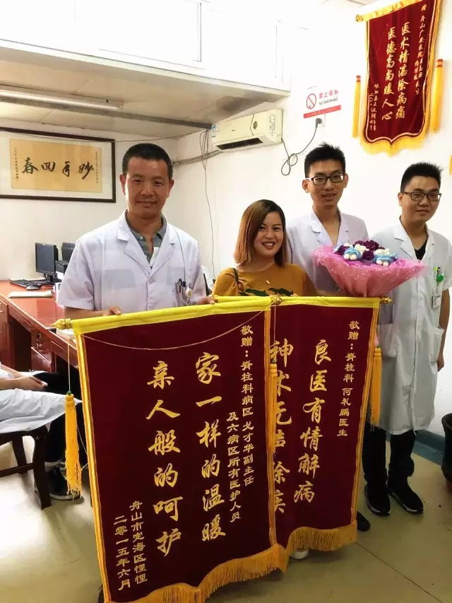 7月12日上午,廣安醫(yī)院副院長劉志安及脊柱科全體醫(yī)護(hù)人員收到了錦旗與鮮花,而送這錦旗和鮮花的是一位兩年前在舟山廣安醫(yī)院接受過治療的蔣女士。