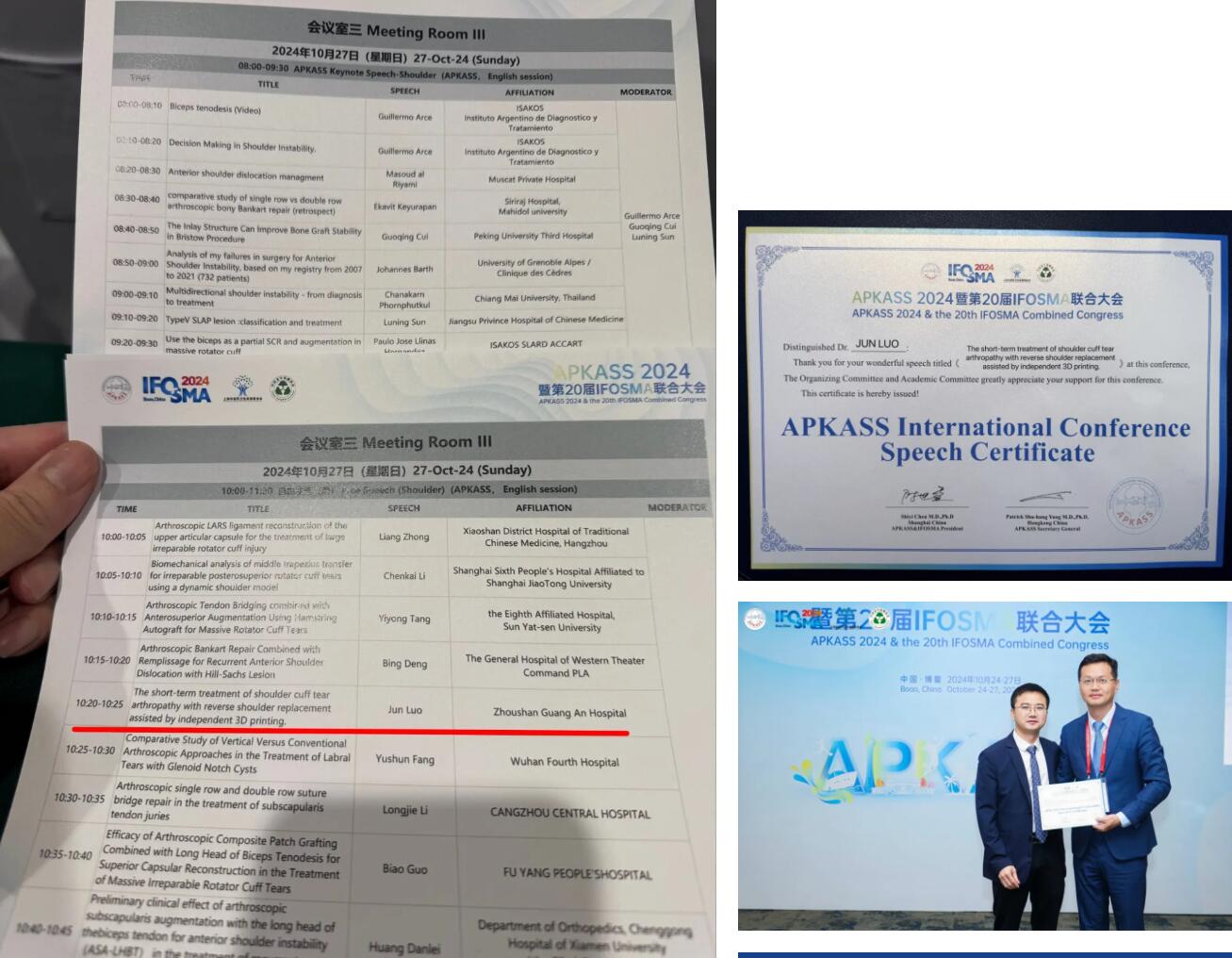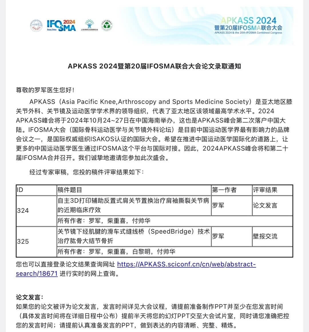 2024年10月24日—27日,亞太膝關(guān)節(jié)、關(guān)節(jié)鏡、運動醫(yī)學(xué)會(APKASS)2024年會暨第20屆國際骨科運動醫(yī)學(xué)與關(guān)節(jié)鏡外科論壇(IFOSMA)聯(lián)合大會在海南博鰲亞洲論壇舉行。我院副院長羅軍主任受邀參加大會并在會上做相應(yīng)發(fā)言。