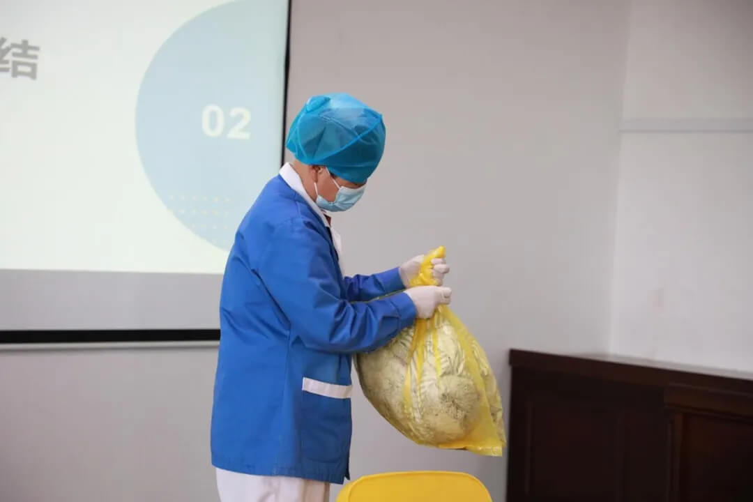 保潔阿姨們參與的醫(yī)廢鵝頸結(jié)封口比賽更是將活動推向了高潮。保潔阿姨們個個精神飽滿,動作利落,熟練地將醫(yī)療廢物袋進行鵝頸結(jié)封口處理。這一比賽項目不僅增強了保潔人員對醫(yī)療廢物規(guī)范處理的意識,也進一步提升了她們的實際操作能力,為醫(yī)院感染防控工作提供了有力保障。