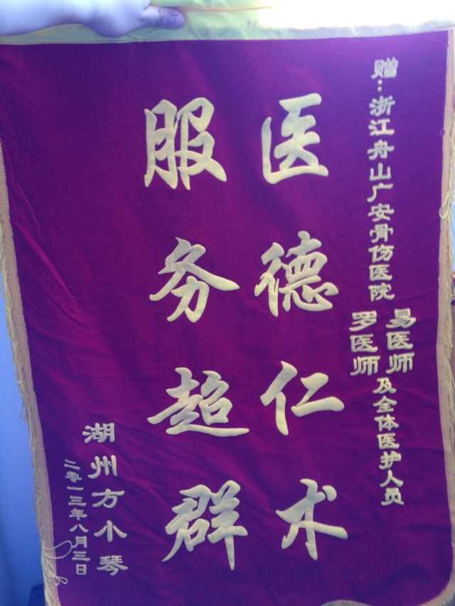 今年8月,時(shí)隔手術(shù)時(shí)間已經(jīng)一年了,方女士千里迢迢從湖州再次趕來我院,為的只是進(jìn)行內(nèi)固定拆除術(shù)。其實(shí)拆除手術(shù),是一個(gè)很簡單的手術(shù),在普通醫(yī)院都能完成。可出于對我院的信任和感激,方女士特地讓兒子開車從湖州趕到舟山。手術(shù)結(jié)束后,方女士顯得激動(dòng)萬分。她說:感謝廣安醫(yī)院醫(yī)生護(hù)士的高超技術(shù)以及細(xì)心照顧,讓我的腿恢復(fù)的這么好。雖然湖州離舟山要好幾個(gè)小時(shí)的車程,可是我不覺得辛苦,因?yàn)槲抑肋@里有最好的醫(yī)生護(hù)士等著我,我對他們的技術(shù)與服務(wù)感到非常的放心。這面錦旗不值錢,可卻代表了我對廣安醫(yī)院的感激之情。