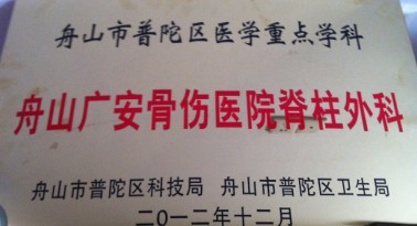 我院脊柱外科被區(qū)衛(wèi)生局組織的第一周期醫(yī)學(xué)重點學(xué)科出科驗收中榮獲三等獎,2012年12月我院脊柱外科被普陀區(qū)科技局、普陀區(qū)衛(wèi)生局評為舟山市普陀區(qū)醫(yī)學(xué)重點專科。