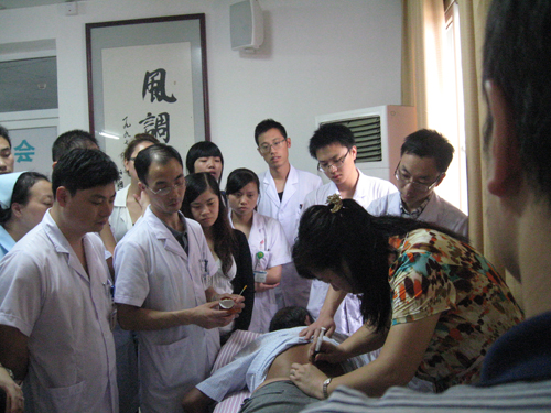 醫(yī)護人員認真學(xué)習(xí)孟教授的扎針技術(shù)
