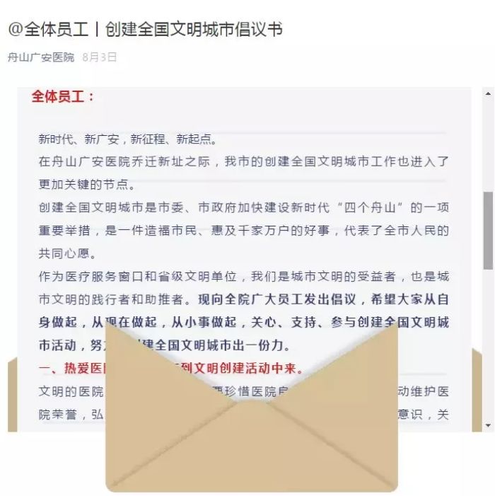 8月3日,舟山廣安醫(yī)院向全體員工發(fā)送了這樣一條微信,內(nèi)容是《創(chuàng)建全國(guó)文明城市倡議書(shū)》。