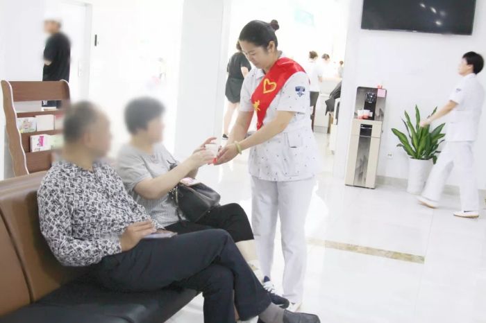 從掛號(hào)到診室,她們提供一站式導(dǎo)醫(yī)服務(wù)。一米線(xiàn)前,她們會(huì)微笑著引導(dǎo)患者排隊(duì);診室門(mén)口,她們會(huì)微笑著扶老人坐下。
