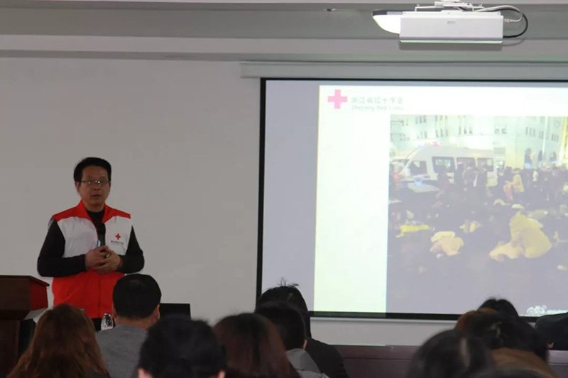 來自浙江海洋大學校醫(yī)院副院長俞曉明老師(浙江省紅十字一級救護培訓師)通過理論知識與實際操作相結合的方式為大家詳細講解了各類意外狀況發(fā)生時的緊急救護方法,也為大家糾正了生活中的常見救護誤區(qū)。
