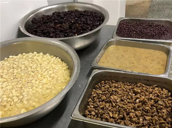 早在臘八前一天,廣安醫(yī)院食堂的工作人員就已經(jīng)忙碌開了,剝蓮子、洗紅棗、切核桃仁......