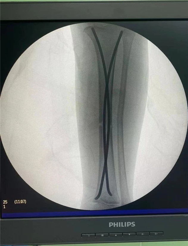 據(jù)羅主任介紹,兒童骨折絕不是成人骨折的縮小版。兒童的不穩(wěn)定性脛骨骨折或雙側(cè)脛骨骨折,保守治療很難達(dá)到理想復(fù)位,可能會造成肢體不等長、成角旋轉(zhuǎn)畸形、肌肉萎縮等并發(fā)癥。而彈性髓內(nèi)釘?shù)膽?yīng)用,正好解決了患者和醫(yī)生所擔(dān)心的問題,既理想地固定了骨折,又不影響肢體美觀,可謂一舉兩得。“彈性髓內(nèi)釘”技術(shù)可在保護(hù)骺板不受損傷的前提下,利用多點固定的原理,微創(chuàng)、有效地治療3—15歲的四肢長骨骨折患兒。手術(shù)在C型臂全程引導(dǎo)下,只需在骨折遠(yuǎn)、近端各切一2—3cm切口打入彈性髓內(nèi)釘,創(chuàng)傷極小,不影響孩子的骨骼發(fā)育,對于骨折的愈合以及孩子以后骨骼發(fā)育影響小。相比之下,既有效避免了切開復(fù)位鋼板內(nèi)固定創(chuàng)傷大、疤痕大等缺點,又有效避免了支架外固定鋼針外露、不易護(hù)理等弊端。