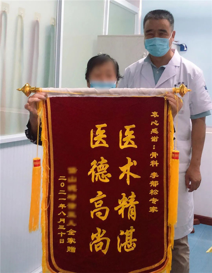 9月27日,患者徐阿婆一家將一面寫有“醫(yī)德高尚 醫(yī)技精湛”的錦旗送到了舟山廣安醫(yī)院骨科中心首席專家李郁松教授的手中。