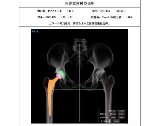 據(jù)羅軍主任介紹,他們首先將鄭阿姨的術(shù)前CT數(shù)據(jù)導(dǎo)入到系統(tǒng)中,通過自動識別骨盆和股骨建立了計(jì)算機(jī)數(shù)字三維模型。AI HIP顯示患者適合使用合適的髖臼杯、股骨柄、標(biāo)準(zhǔn)陶瓷球頭、陶瓷內(nèi)襯,并精準(zhǔn)定位了截骨線,有效幫助醫(yī)生在手術(shù)中做到精確截骨。