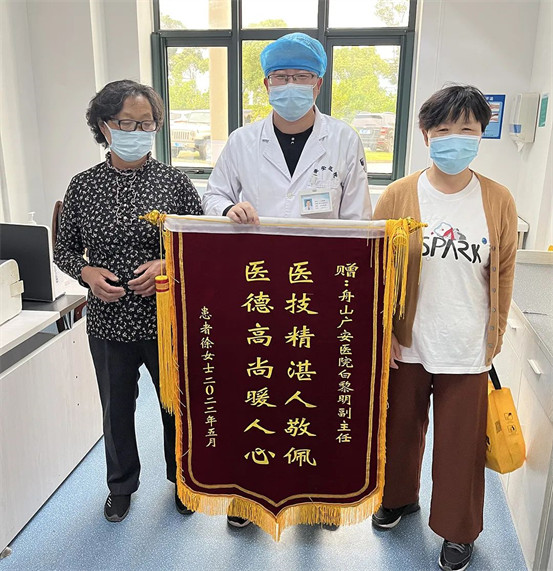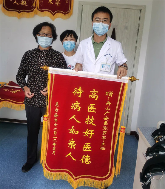 5月26日,徐女士的家人來到舟山廣安醫(yī)院,她們手里拿著繡著“高醫(yī)技好醫(yī)德 待病人如親人”、“醫(yī)技精湛人敬佩 醫(yī)德高尚暖人心”的錦旗,表示要將這兩面錦旗送到骨科中心羅軍主任和白黎明副主任的手中,向他們表達(dá)自己真摯的感激之情。