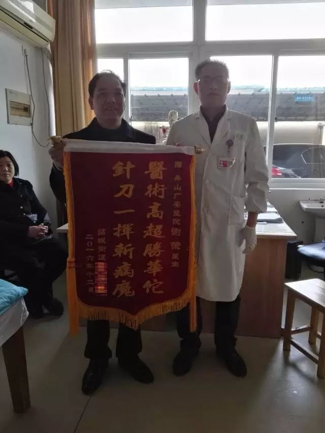 12月7日下午,來自江蘇的夏先生將一面寫著“醫(yī)術(shù)高超勝華佗 針刀一揮斬病魔”的錦旗送至廣安醫(yī)院針刀科主任謝榮手中。