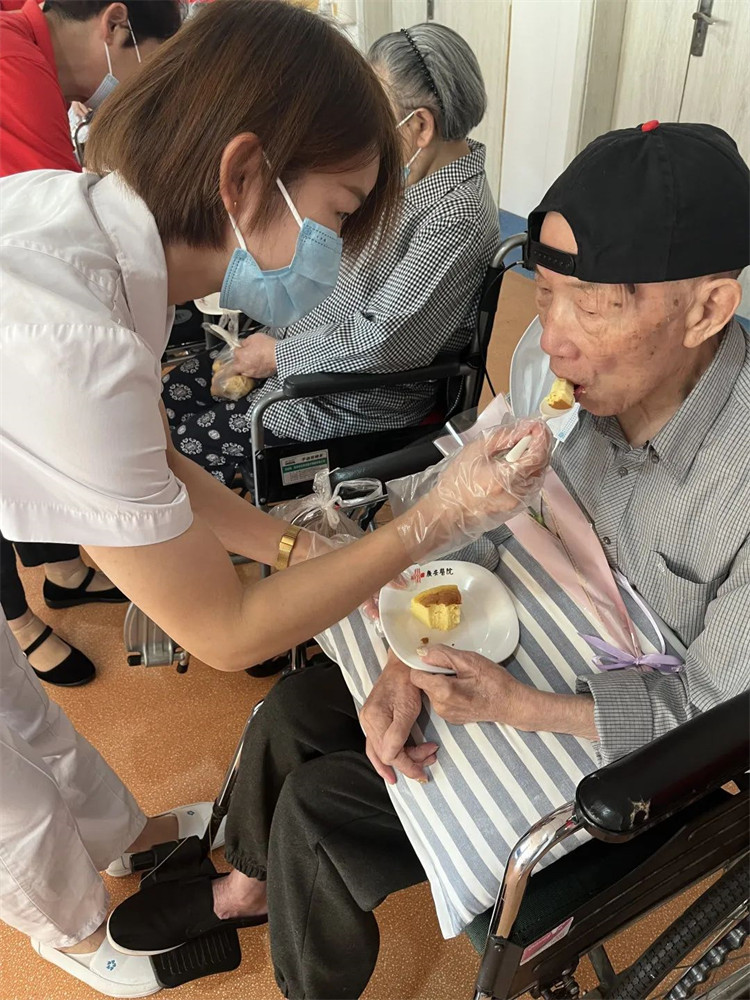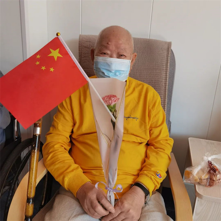 醫(yī)護(hù)人員將可口美味的節(jié)日小蛋糕和鮮花遞到張爺爺?shù)氖稚?,老人開心的笑成了一條直線。張爺爺說:“這蛋糕真好吃,住在這里真好,家的味道”!小小的蛋糕和鮮花包含深深的祝福,祝福天下老人幸福、健康、平安,快樂。