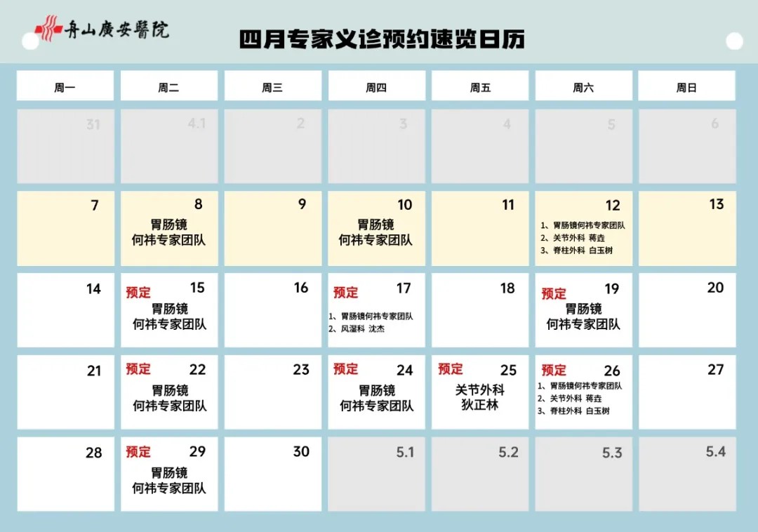 每月專(zhuān)家義診預(yù)約速覽日歷