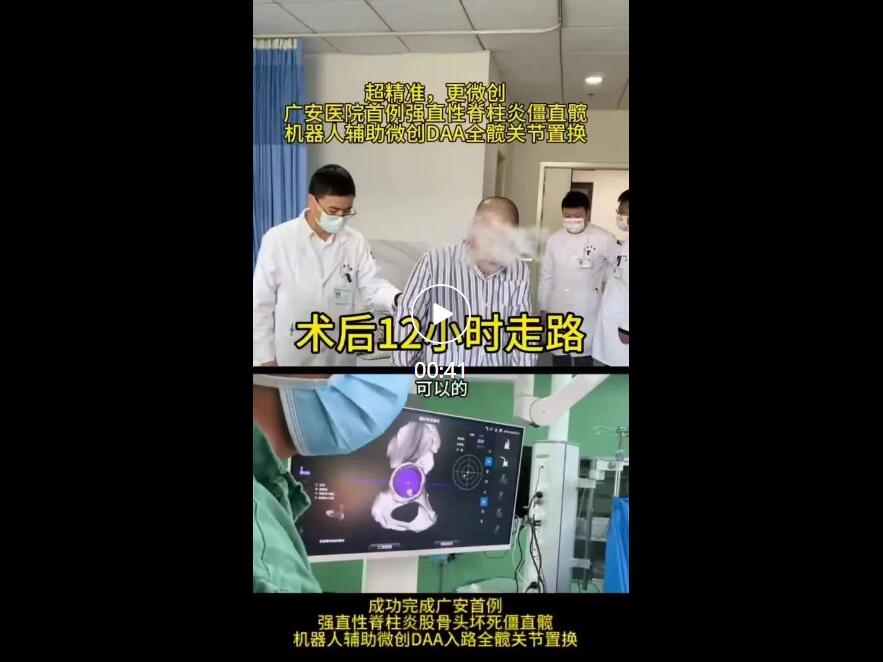 近日,舟山廣安醫(yī)院關節(jié)科羅軍主任帶領手術團隊成功完成首例強直性脊柱炎僵直髖機器人輔助前方入路(DAA)微創(chuàng)全髖關節(jié)置換,患者術后12小時下地走路,術后一周棄拐行走并順利康復,標志著我院高難度關節(jié)置換手術再攀高峰,開啟了超精準的微創(chuàng)新時代,為患者再添新福音。