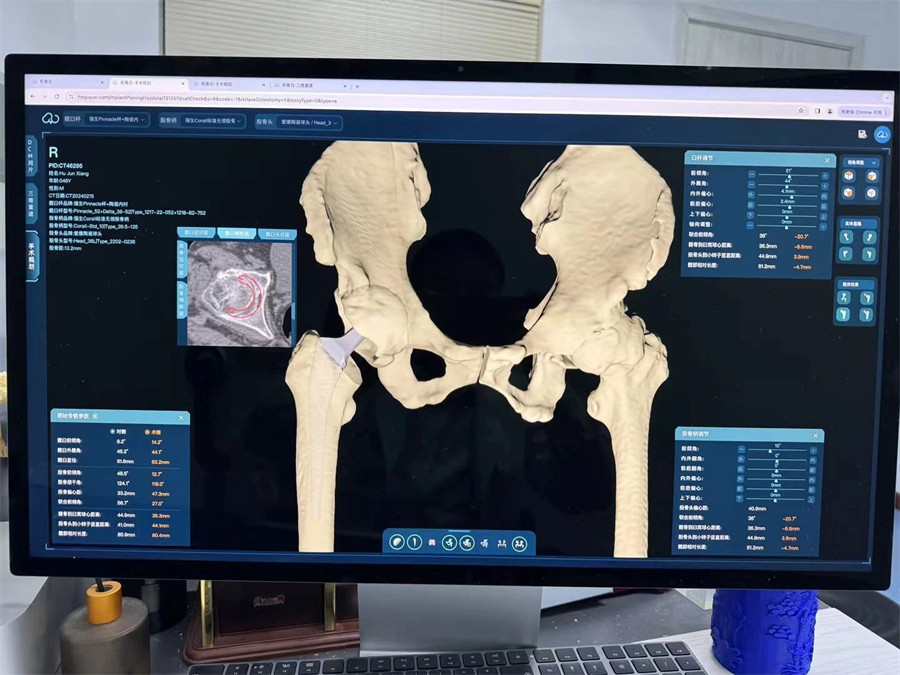 術中,DAA入路充分顯露髖臼,順利注冊好標記點,機械臂精準地定位到預期規(guī)劃位置,輔助完成髖臼的磨銼和髖臼杯放置,羅軍主任與手術團隊成員參照術前規(guī)劃,協(xié)同機器人“作戰(zhàn)”,對髖臼窩進行了亞毫米級的精確磨銼,將髖臼杯的安裝角度控制到了1°以內(nèi),達到了精確的效果,手術圓滿完成。