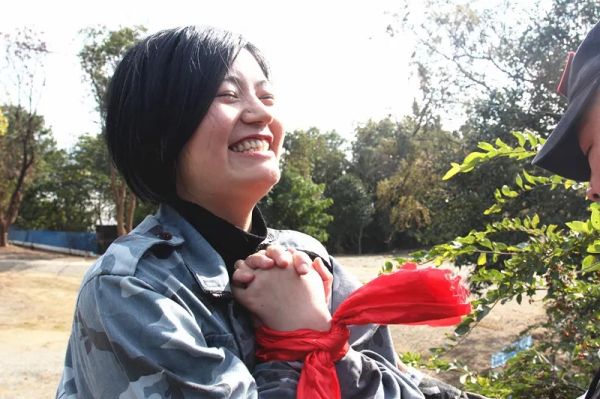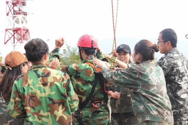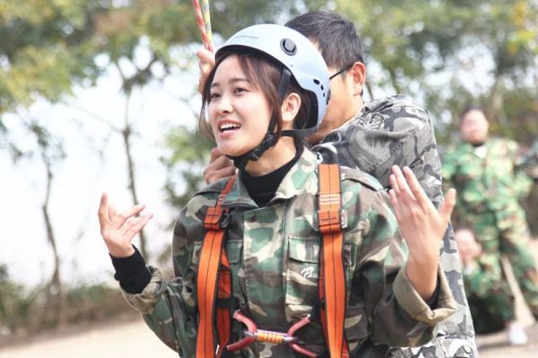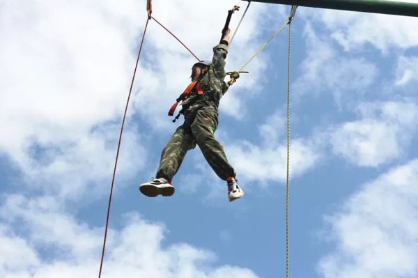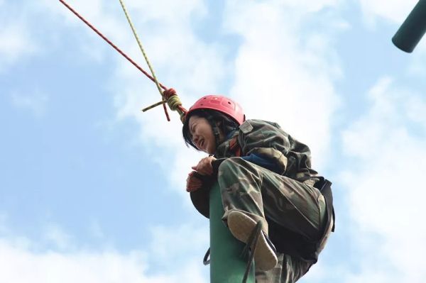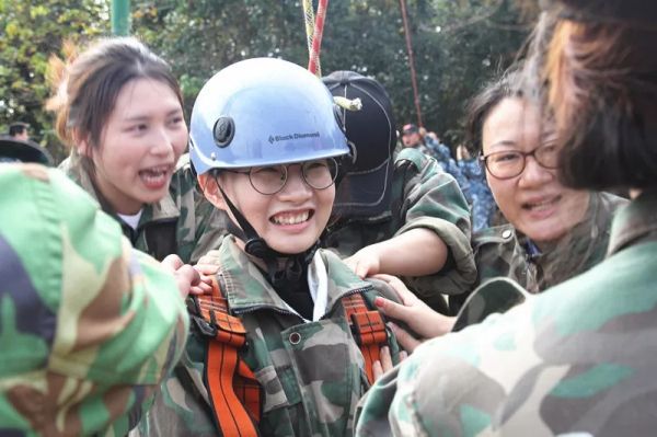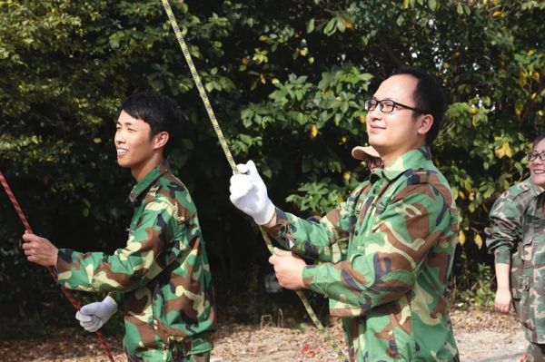 當隊員雙手內(nèi)翻并用繩子栓緊內(nèi)扣,倒數(shù)一二三倒在其他隊員搭建的手臂上時,大家一起用堅實有力的臂膀托住隊友,成功的喜悅都在大家的笑聲里。