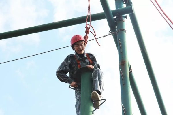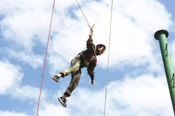 在教練員的簡單示范后,一名隊員穿上全身式安全帶、戴上安全頭盔、鐵扣掛住主繩,在全體隊員的加油聲中勇往直前,爬上鐵柱桿子,在最高點跳向掛在高空的單杠。而其他隊員正認真又緊張的拉住保護繩,給隊友百分百的安全保障。