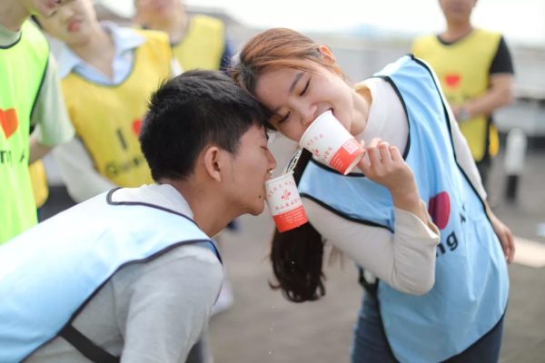 參賽的青年醫(yī)護(hù)人員分為藍(lán)、綠、橙、黃四組,分別在四方拔河、集群尋寶、借力倒水、智力猜謎、速吸酸奶、即興演唱等項(xiàng)目上展開角逐。